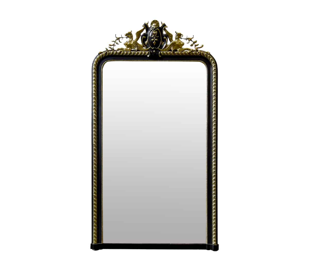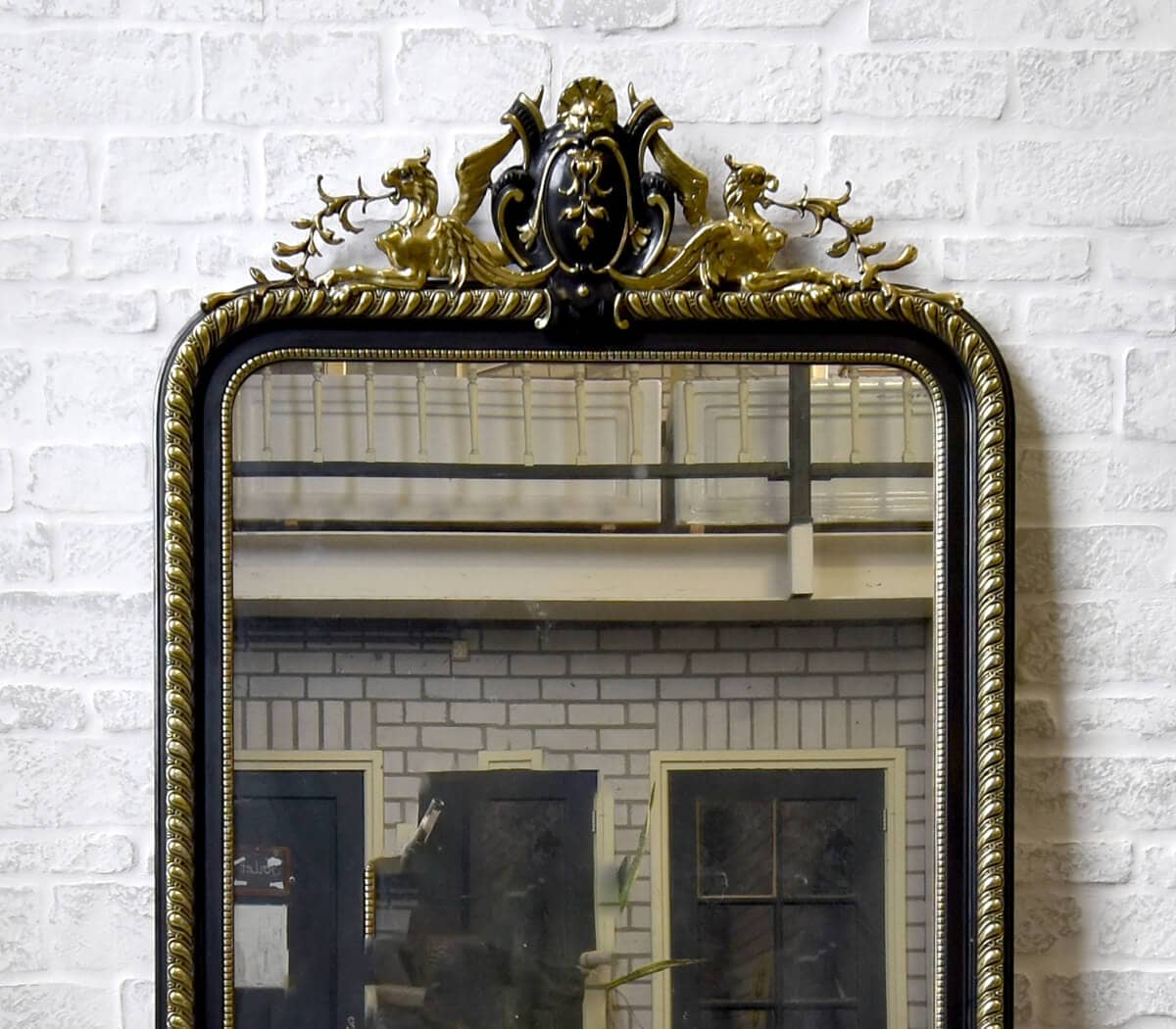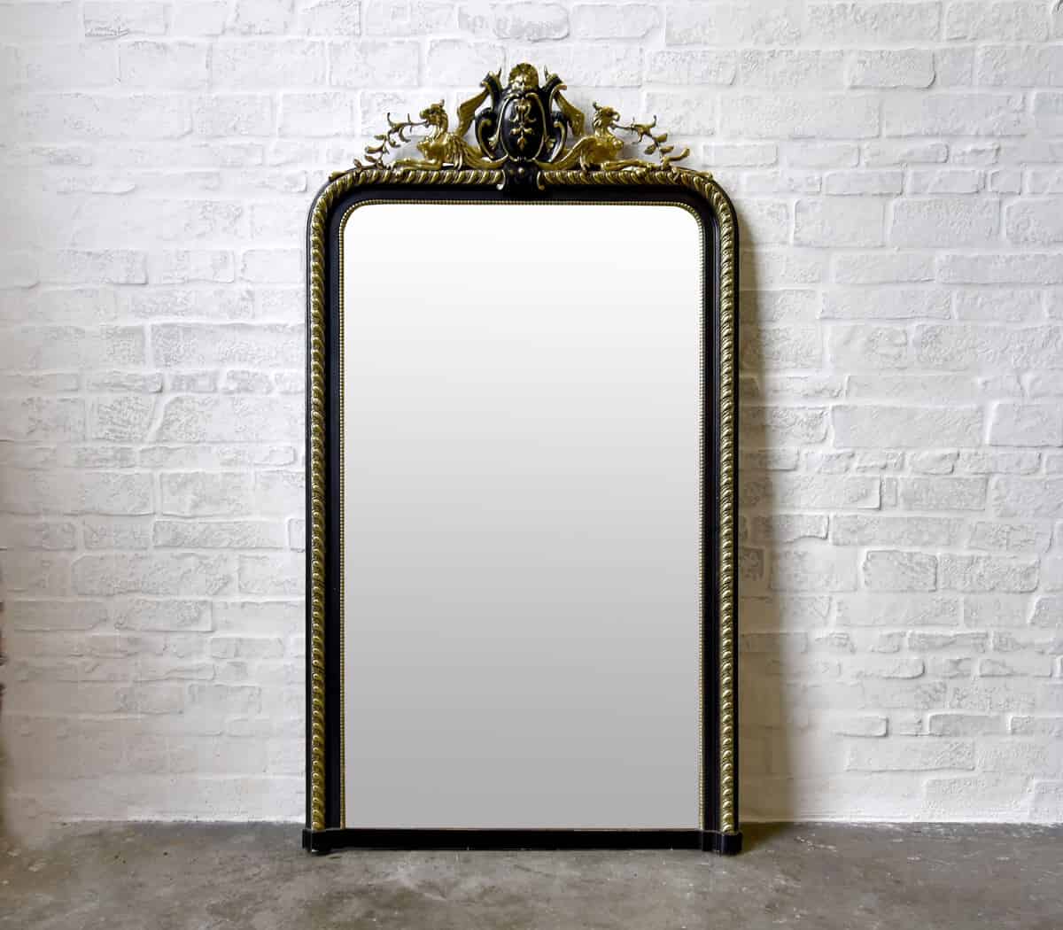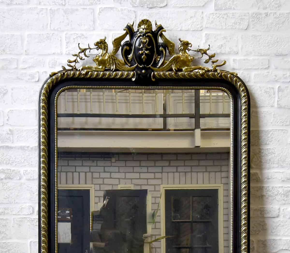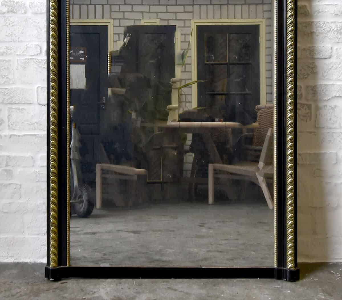 Deze antieke spiegel heeft een versiering op de lijst en een parelrand rondom.