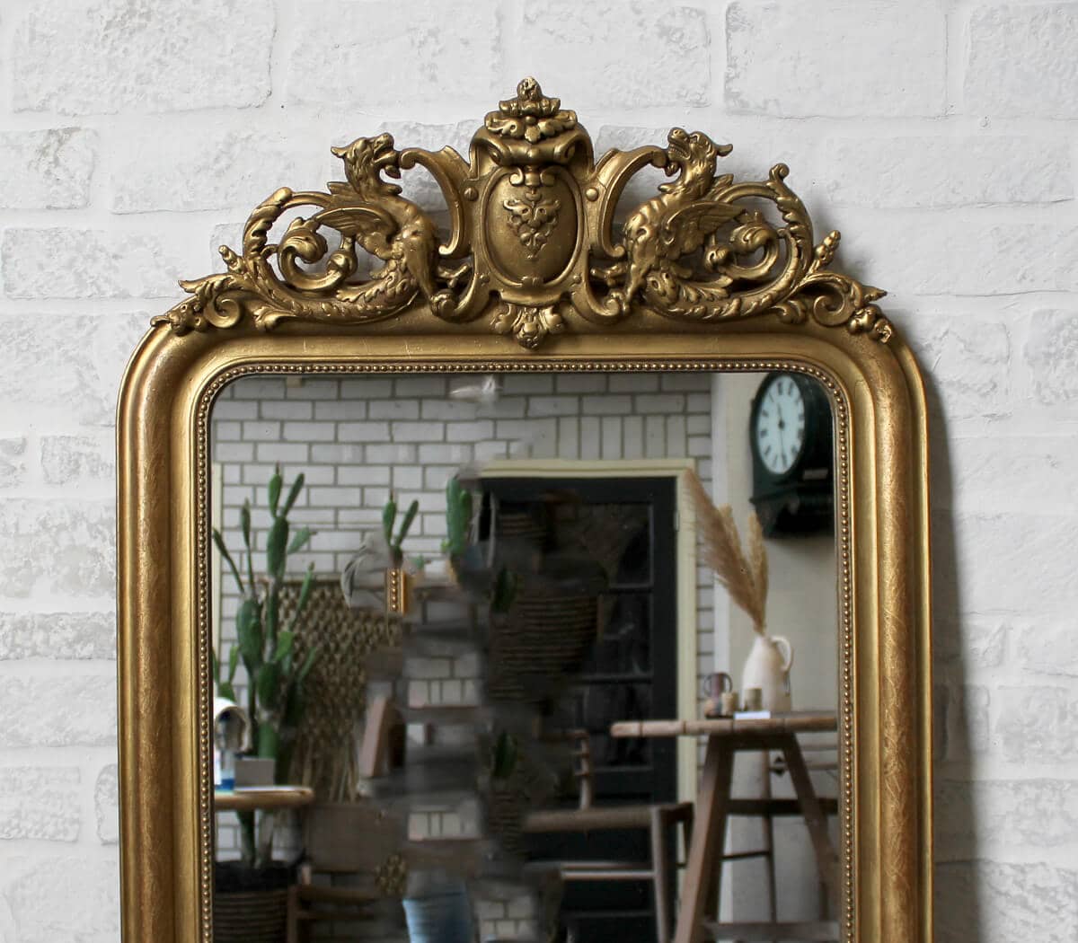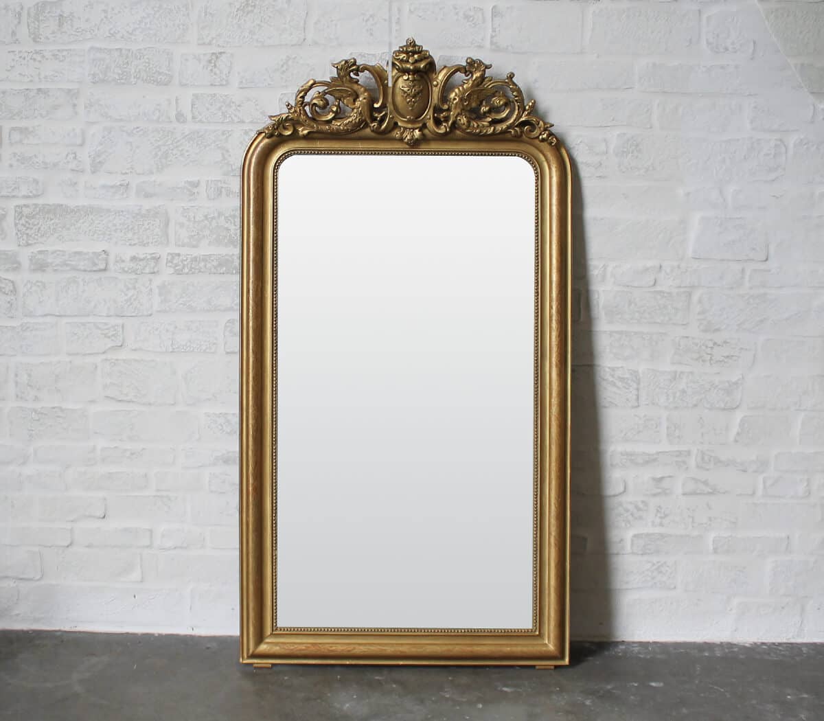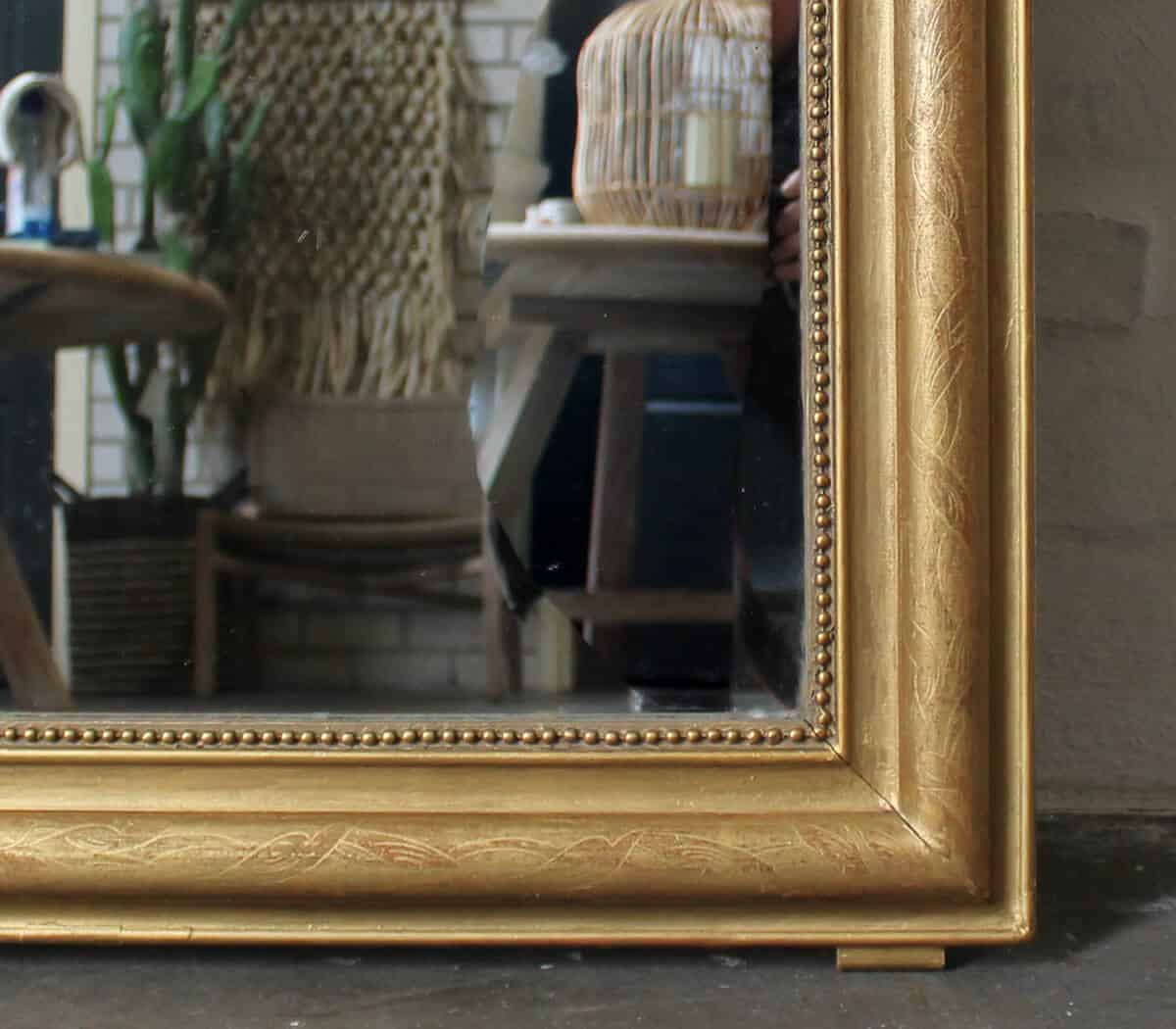 Deze antieke spiegel heeft een versiering op de lijst en een parelrand rondom.