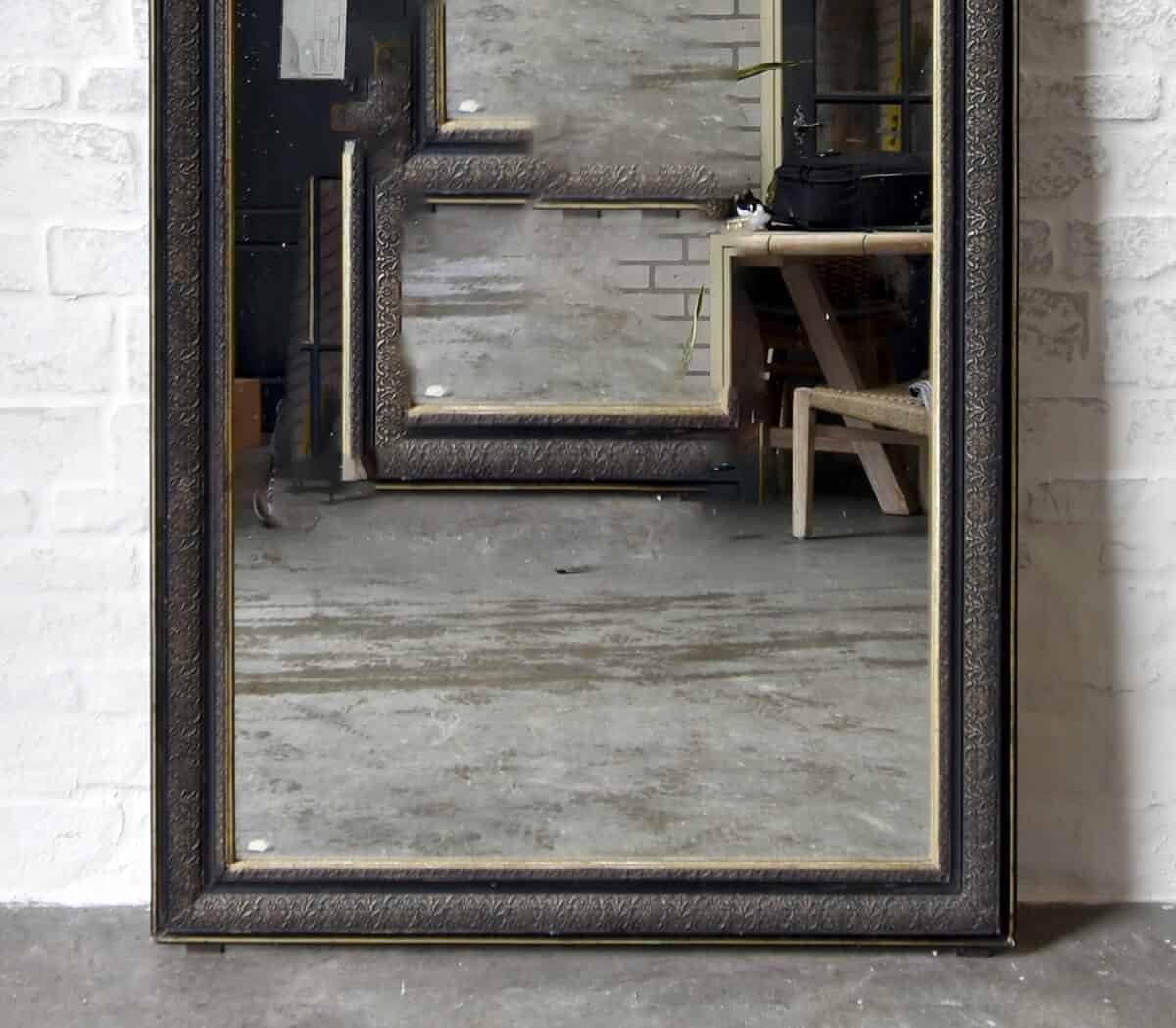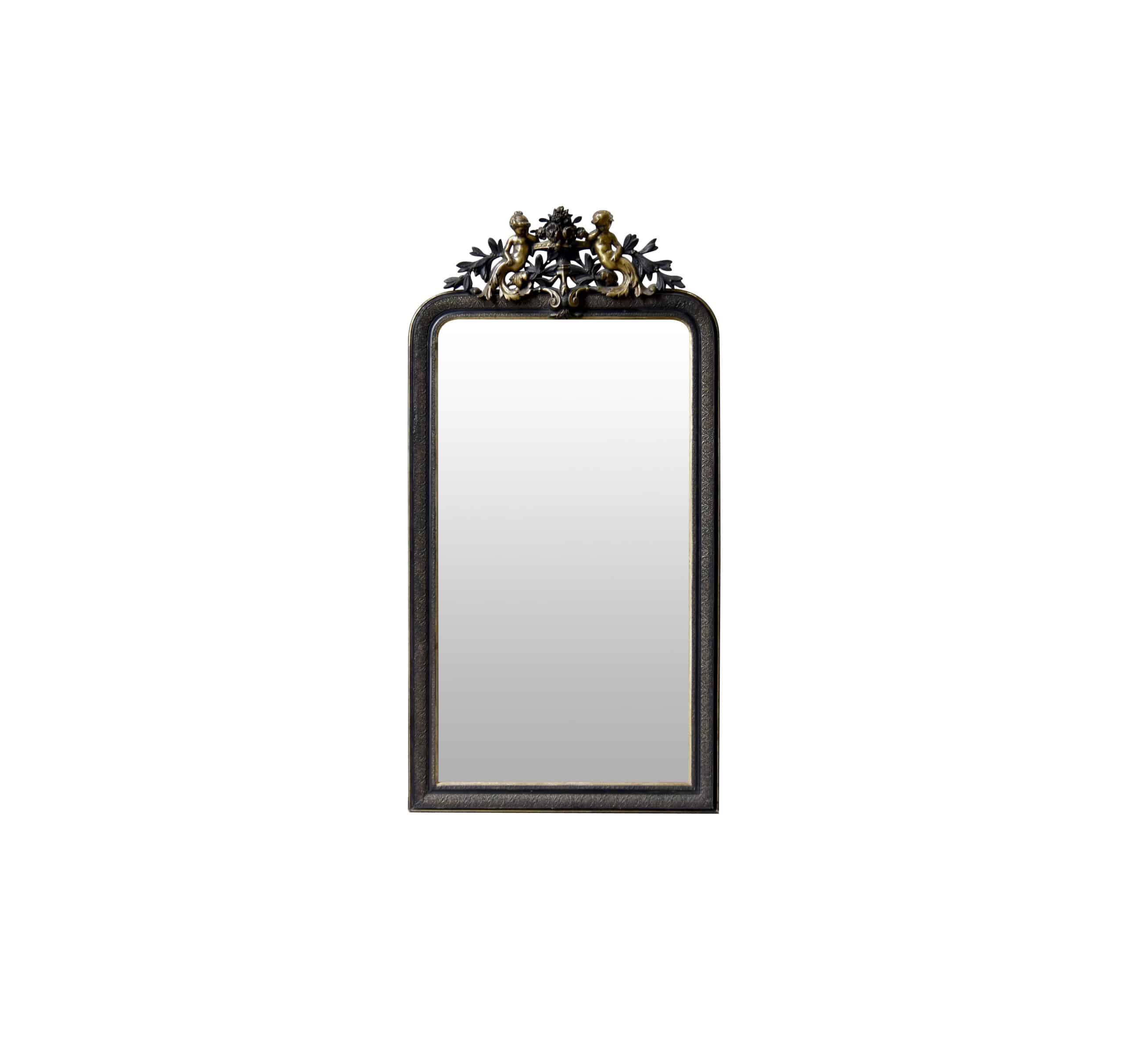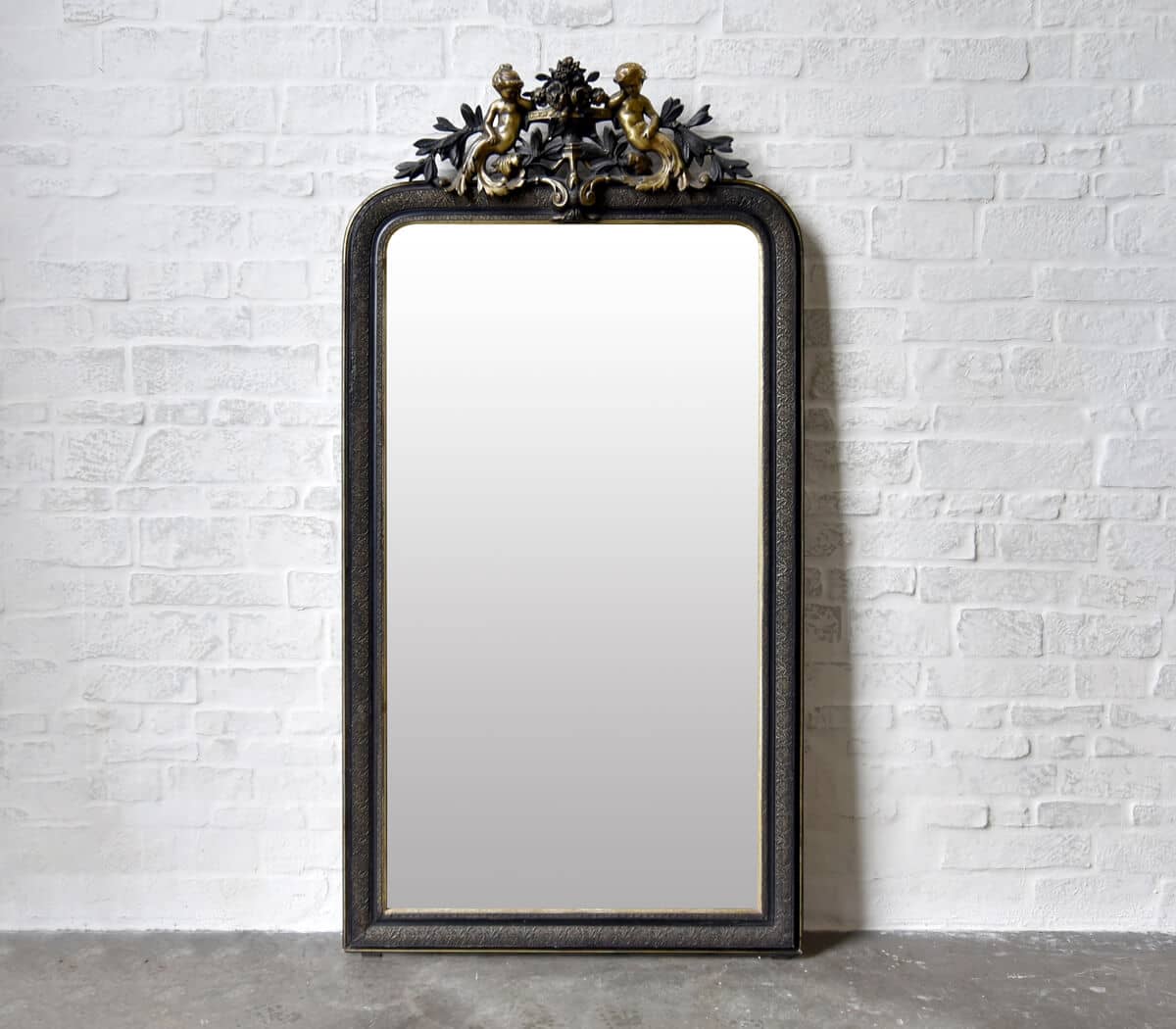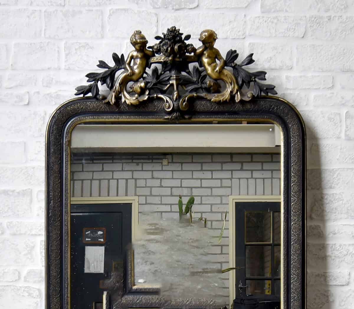 Deze antieke spiegel heeft een ornament met engeltjes en mooi versierde lijst.