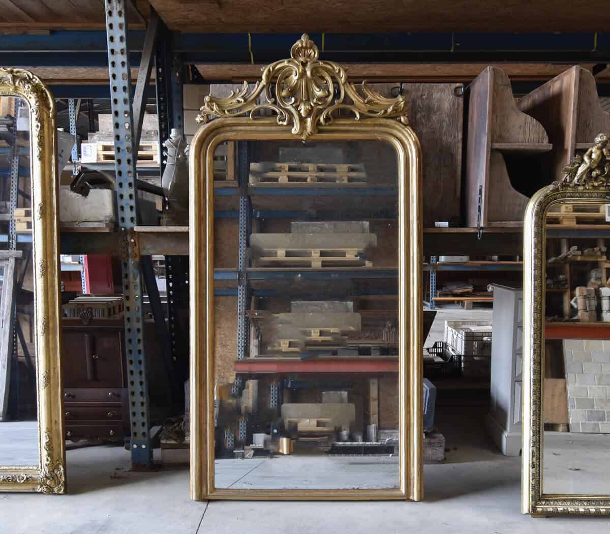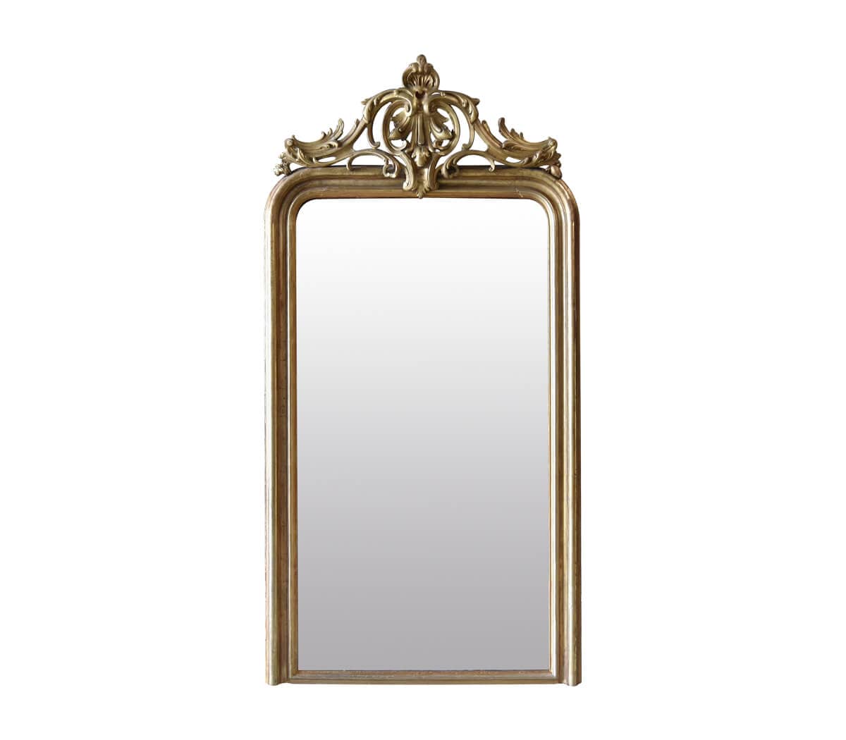 Deze antieke spiegel met strakke lijst en een mooi uitgewerkt ornament.