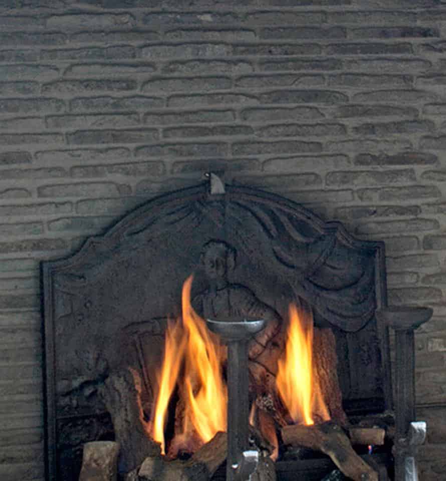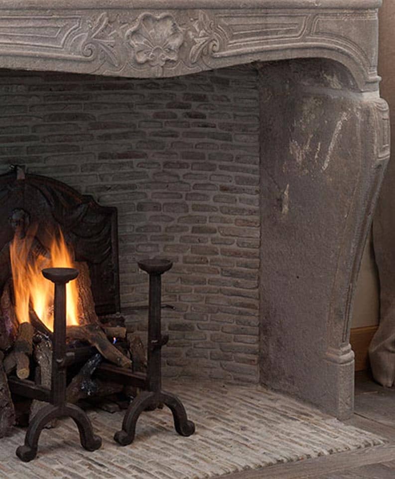 Oude grijze parfeuilles. In combinatie met een antieke gietijzeren haardplaat is deze oude tegel heel geschikt om aan de binnenkant van uw schouw verwerkt te worden. Daarna maakt u het evt. helemaal af met antieke vuurbokken met daarop een stookrooster.