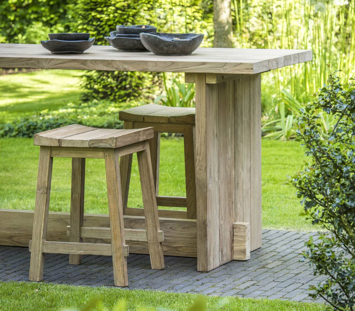 De bartafel is puur, eigentijds, rustiek en een prachtige weergave van het natuurlijke en ruwe materiaal. Gemaakt van karakteristiek teakhout in natuurlijk grijs.