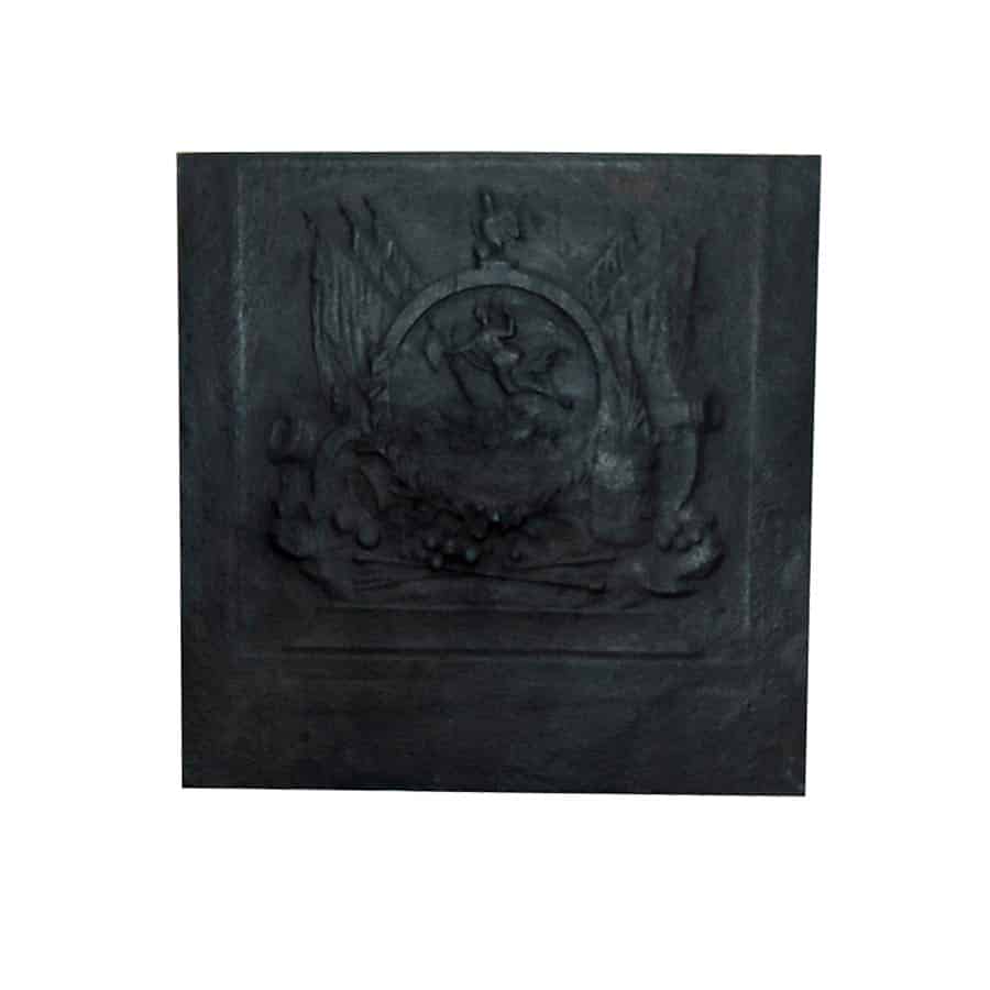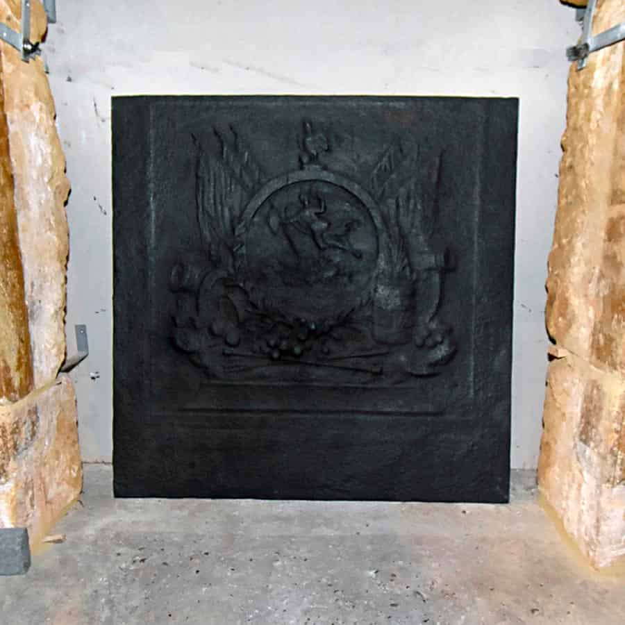 Antieke haardplaat. Decoratief en functioneel als achterwand/bescherming vuurplaats en weerkaatsing warmte/extra rendement. ’t Achterhuis heeft een doorlopende collectie van 250 antieke gietijzeren haardplaten. Deze worden ook wel gietijzeren stookplaat genoemd met als functie warmte weerkaatsing en bescherming van uw stenen vuurmond. Meestal zijn deze platen in perfecte conditie. Antieke platen met een scheurtje worden in onze eigen smederij gerestaureerd.