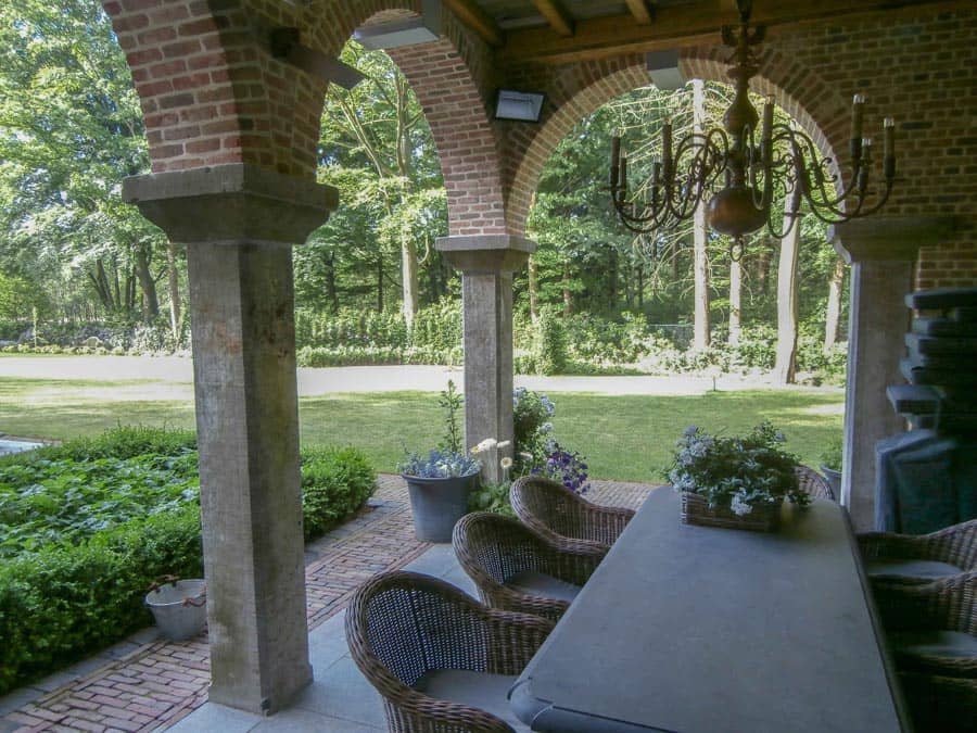 Overdekt terras met tafel van Belgisch hardsteen