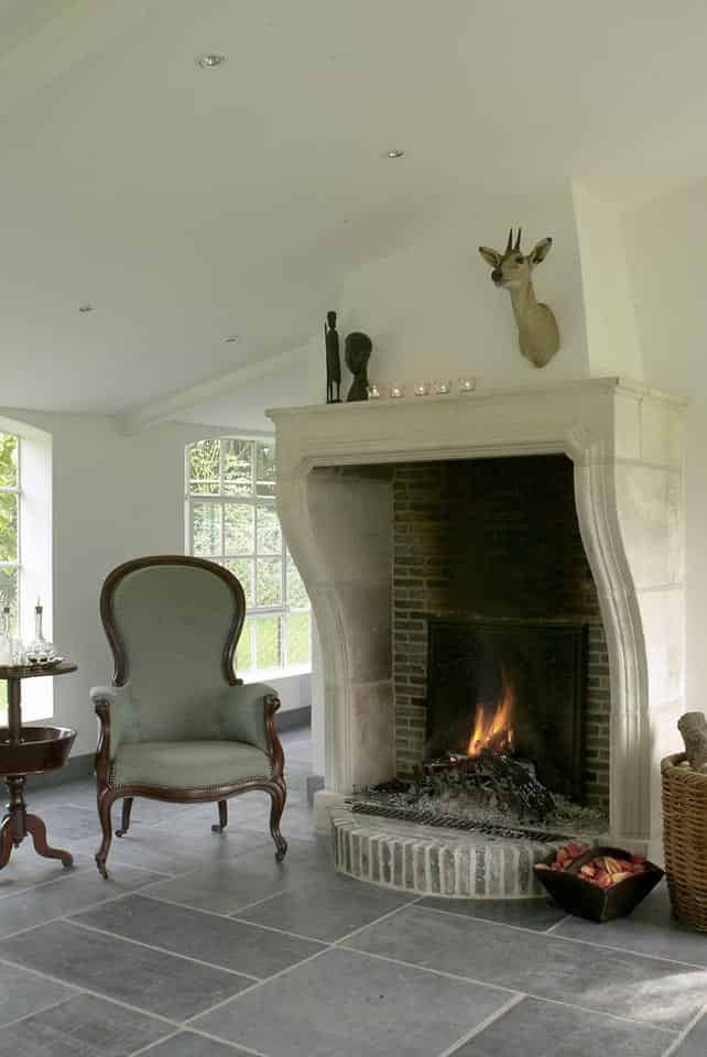 Kleine grijze stenen voor in de vuurmond van uw openhaard of schouw. In onze showrooms ziet u alles verwerkt zoals het er bij u uit kan komen te zien. Het beste kan u stenen in een vuurmond verwerken met kalkcement. Wel is het raadzaam een antieke gietijzeren haardplaat tegen de stenen te zetten. Heeft behalve de aankleding ook twee belangrijke functies; bescherming van uw stenen en warmte weerkaatsing.